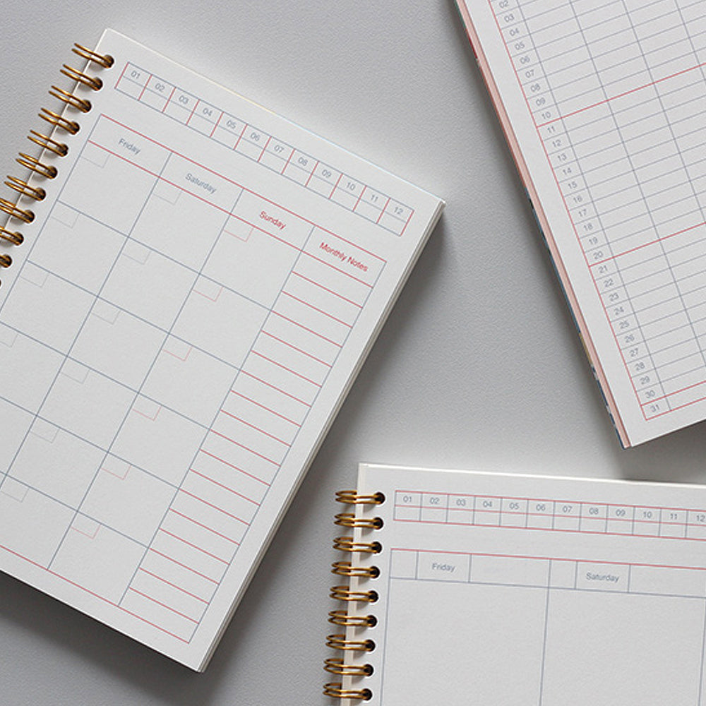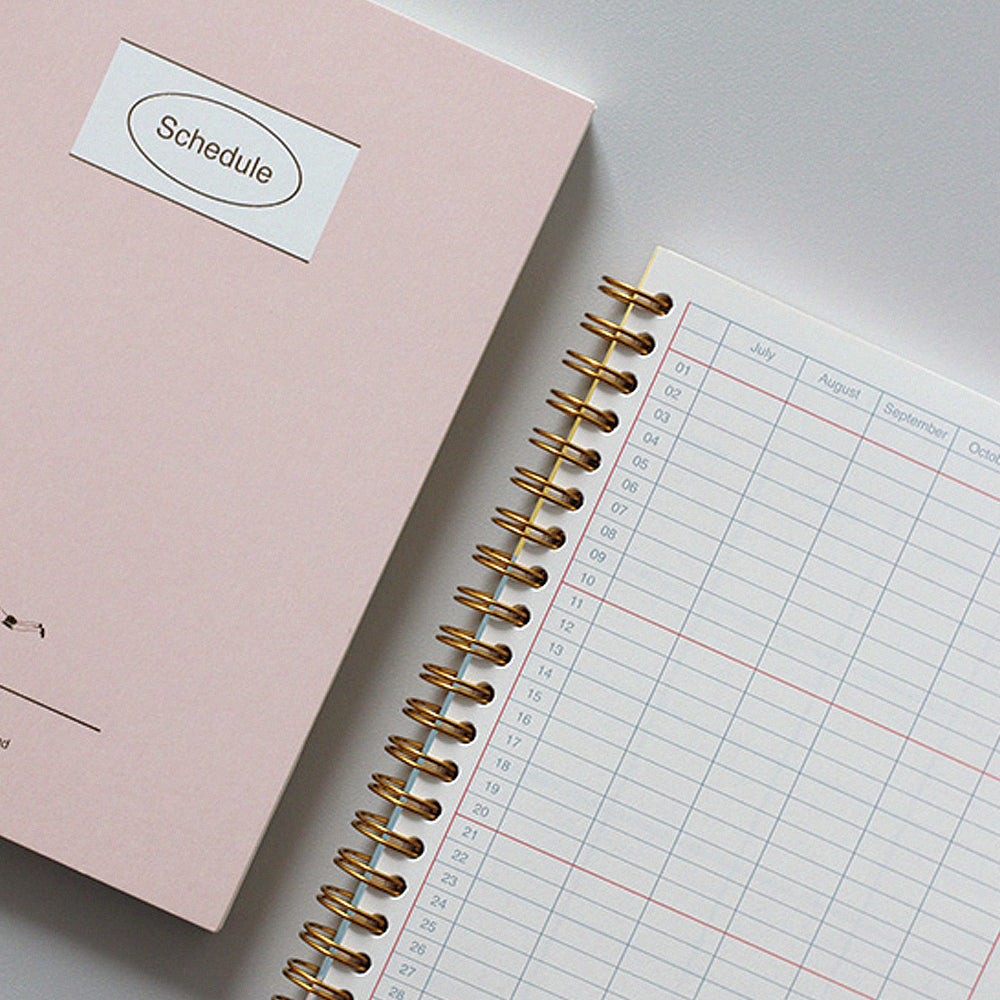 Schedule是一款能記下很多事情的線圈手帳,可完全平攤使用,手帳包含了年計劃、月計劃、週計劃等各個版面,同時亦有讓用家自由書寫的筆記頁,適合任何人士使用。