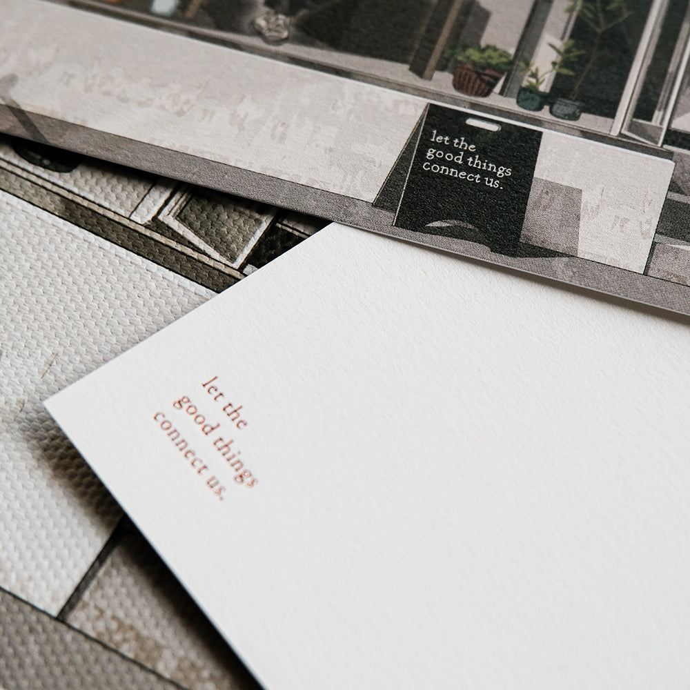 這次委託她為月下文具房繪製特別版的明信片,將首次採用觸感豐富的typograhia印製,同時卡背的文字及月下的標誌亦會以全新的燙金效果呈現,是月下由開業至今最精美的一款明信片。