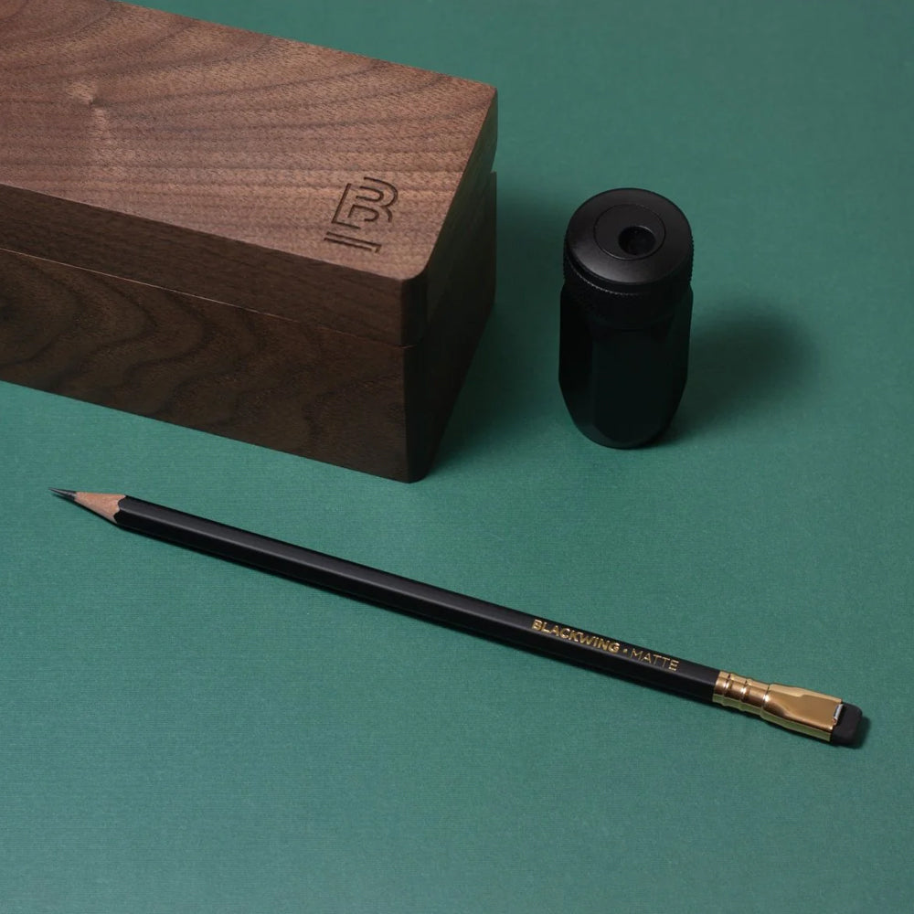 BLACKWING最豪華的鉛筆套裝,收納盒由高質感胡桃木製成,紋理細緻,表面刻有BLACKWING標誌,內裡包含602、Matte、Natural及Pearl四款衡常筆款各六支和黑色One Step Long Point鉛筆刨一個,內襯柔軟軟木墊,並配有磁吸式開合設計,既優雅又能妥善保護盒內物品,與其說它是一件收納工具,它更像一件收藏品,非常適合送禮或作為個人書桌上的擺設。