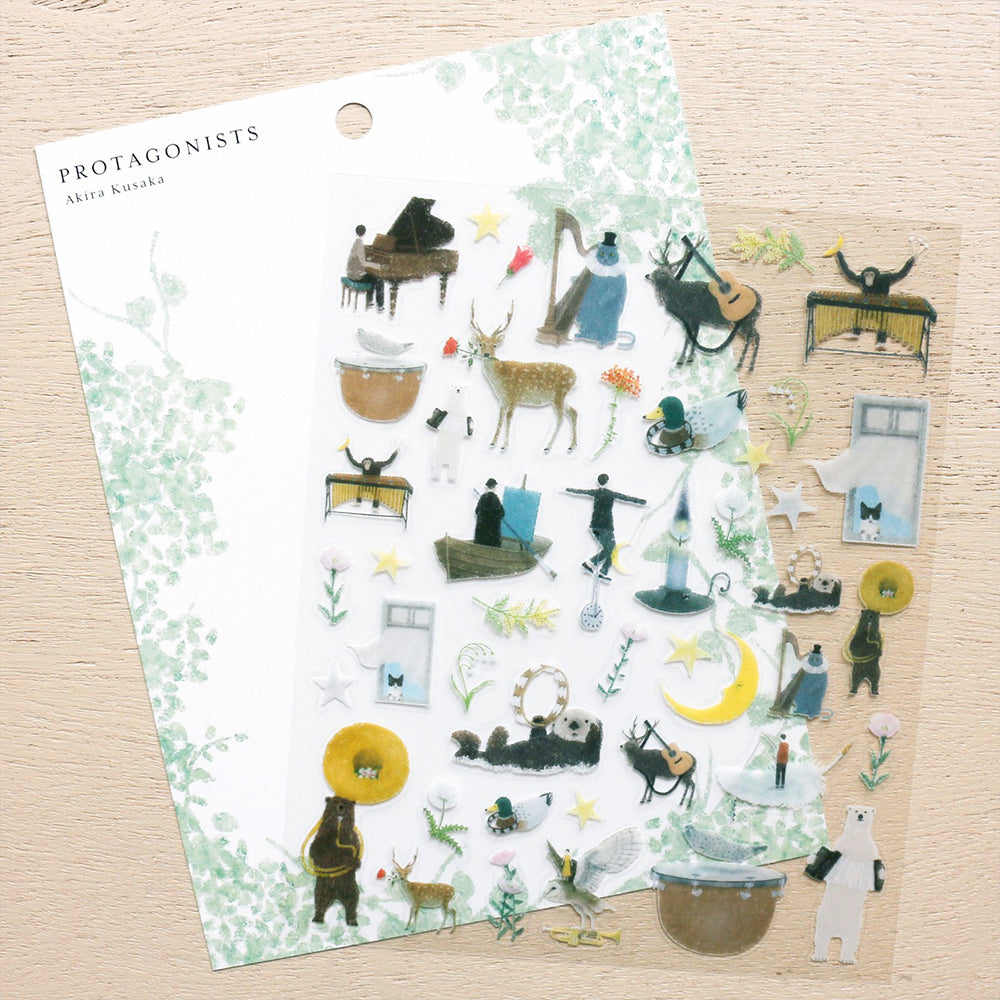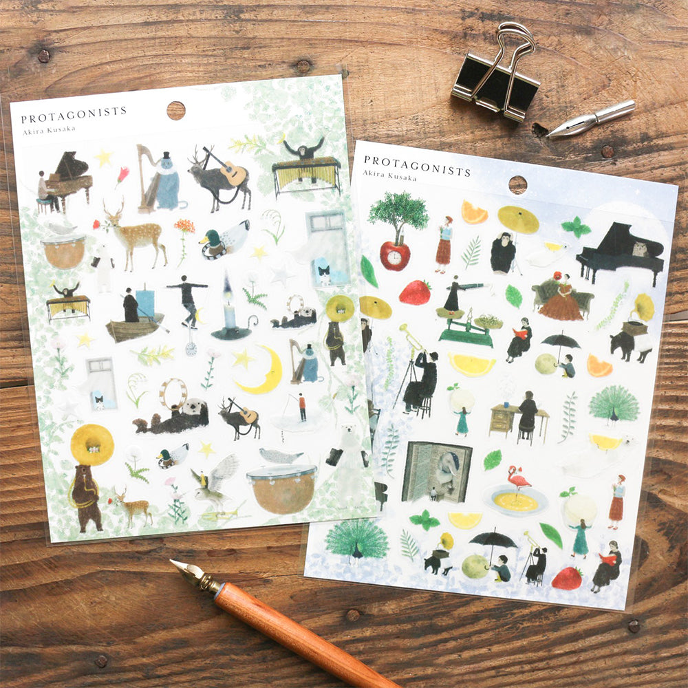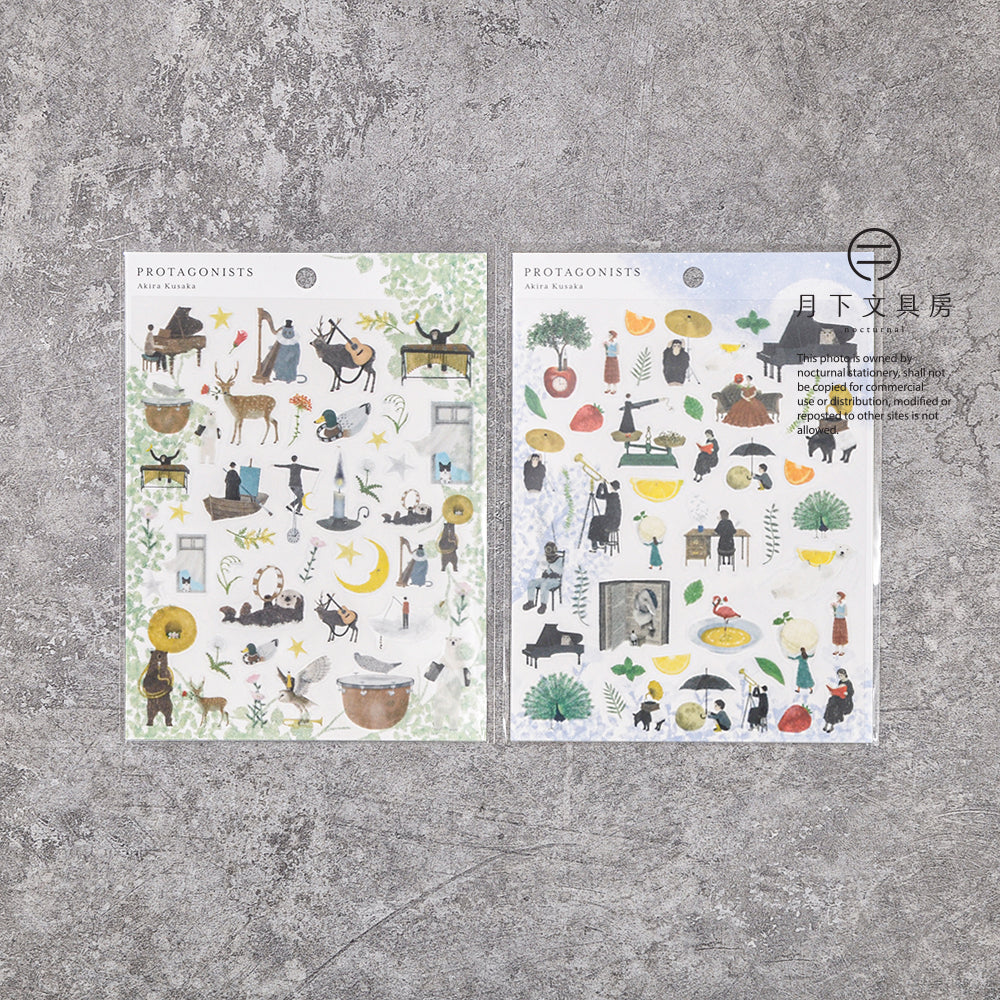 日本音樂插畫家日下明,擅於營造充滿故事性的人物和場景﹐其作品會讓人不自覺地聯想起背後的故事,這次聯同表現社推出的兩款貼紙,除了保留了過往的作品風格,亦加入了樂器和音樂等要素,在此特別推薦給喜歡音樂的朋友。由於貼紙是透明的關係,非常適合用於手帳和禮物包裝上,整張貼紙尺寸約A5,可夾於大部份的手帳之中,方便攜帶。