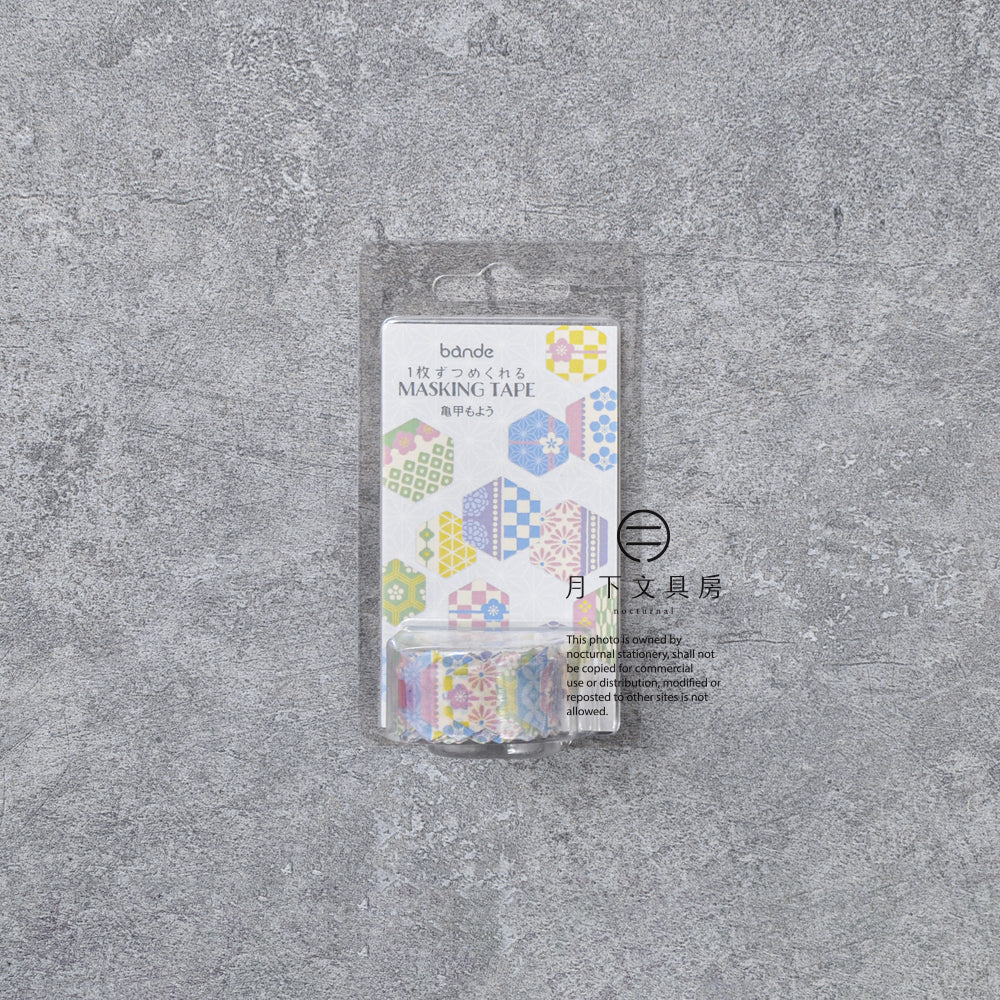 日本文具品牌BANDE向來都以推出手作素材為主,當中的片狀紙膠帶貼紙最為人熟悉,這次貼紙將會以象徵吉祥的龜甲圖案作為主題,並配上柔和顏色,連續使用會有意想不到的效果,適合用於包裝及心意卡上,以傳遞心意和真誠的祝福,一卷共15種不同圖案。