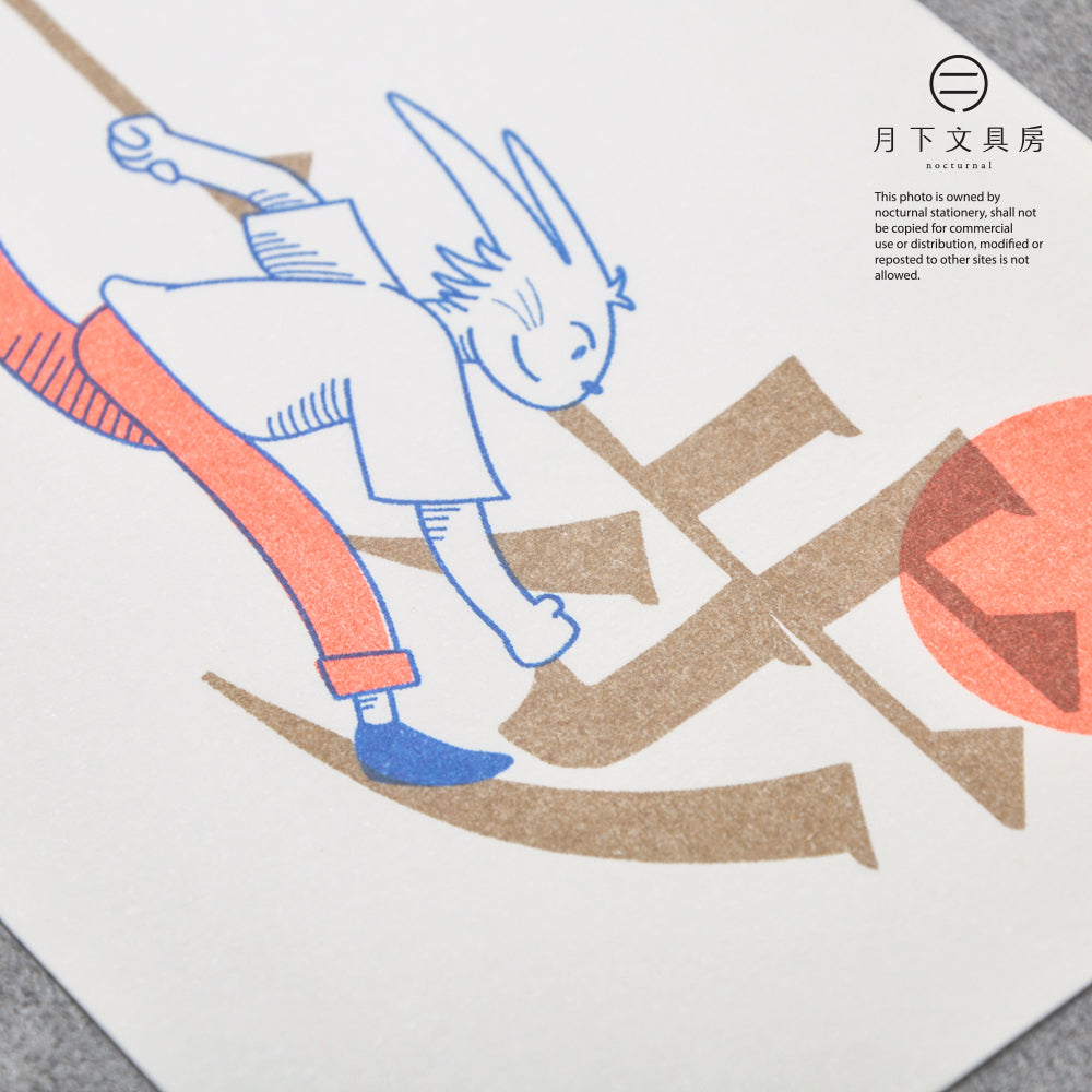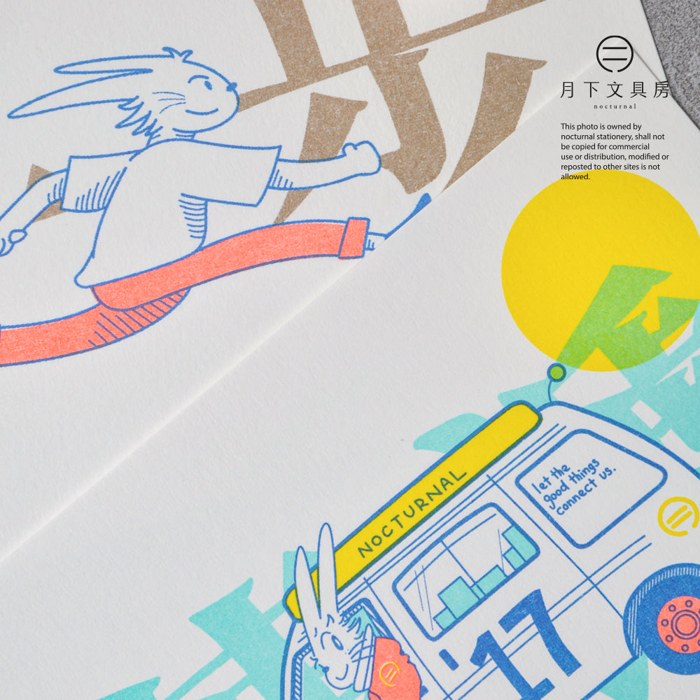 明信片採用Risograph技術印製而成,印製過程有點像印版畫,其亮麗色彩及印刷上的不確定性為這款技術最大的特徵及魅力之處。