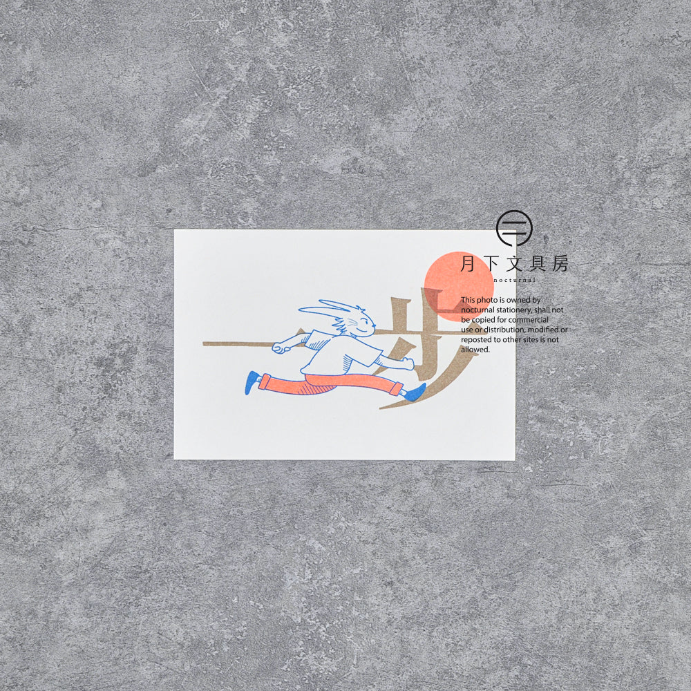 「一步」是為了紀念月下由網店轉為實體店所推出的明信片,喻意月下在這一年作出了重要的一步。明信片中月兔的跨步動作則跟「一步」一詞互相呼應,「一步」對每個人來說都非常重要,不論這是一小步還是一大步,只要是向前的話,這一步對我們的生命都會有著微妙的變化,願大家都能有勇氣相信自己的,走自己想走的道路。