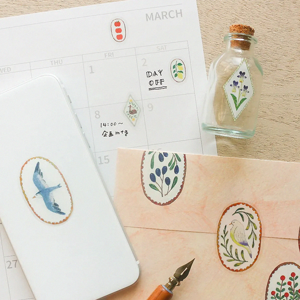 由平面設計師轉職成插畫師的淺野綠,主力從事雜誌、書藉和廣告的插畫,她運用了從事設計師的經驗,構思和製作了多款以插畫為主要元素的餐具和雜貨。她的畫風偏向成熟,擅於描繪充滿異國情調的風景、餐具、植物等主題﹐不會過於可愛,同時深受各年齡層人士的喜愛。這次受到表現社邀請推出的貼紙,將會以優雅的橢圓形和菱形作為貼紙的外觀,你可將它貼於筆記本、信件和禮物上,以增添物件的時尚感。整張貼紙尺寸約A5,可夾於大部份的手帳之中,方便攜帶。