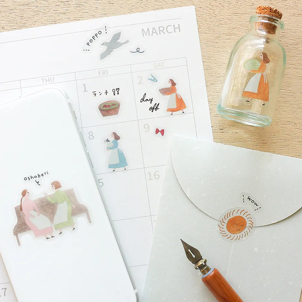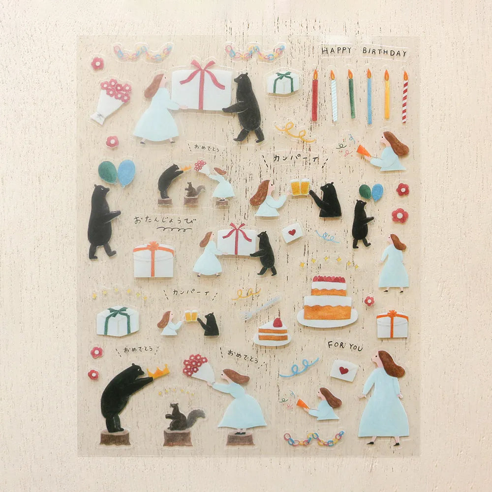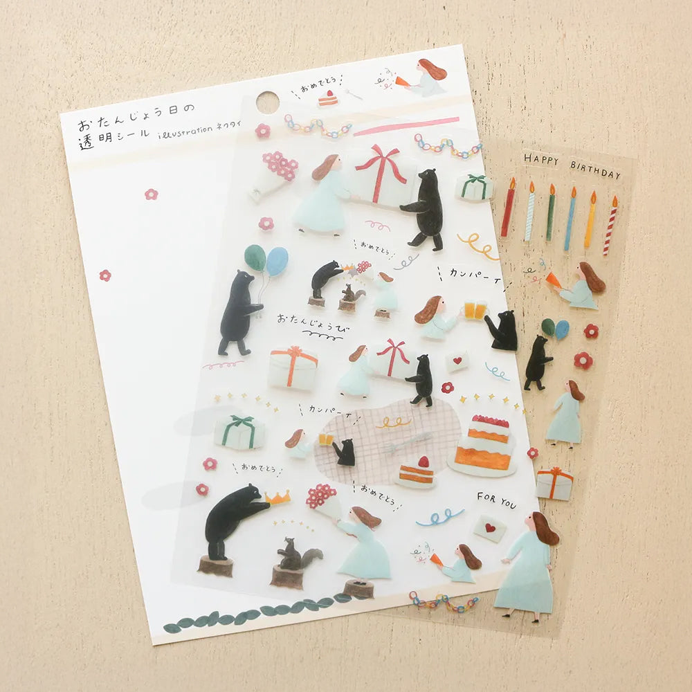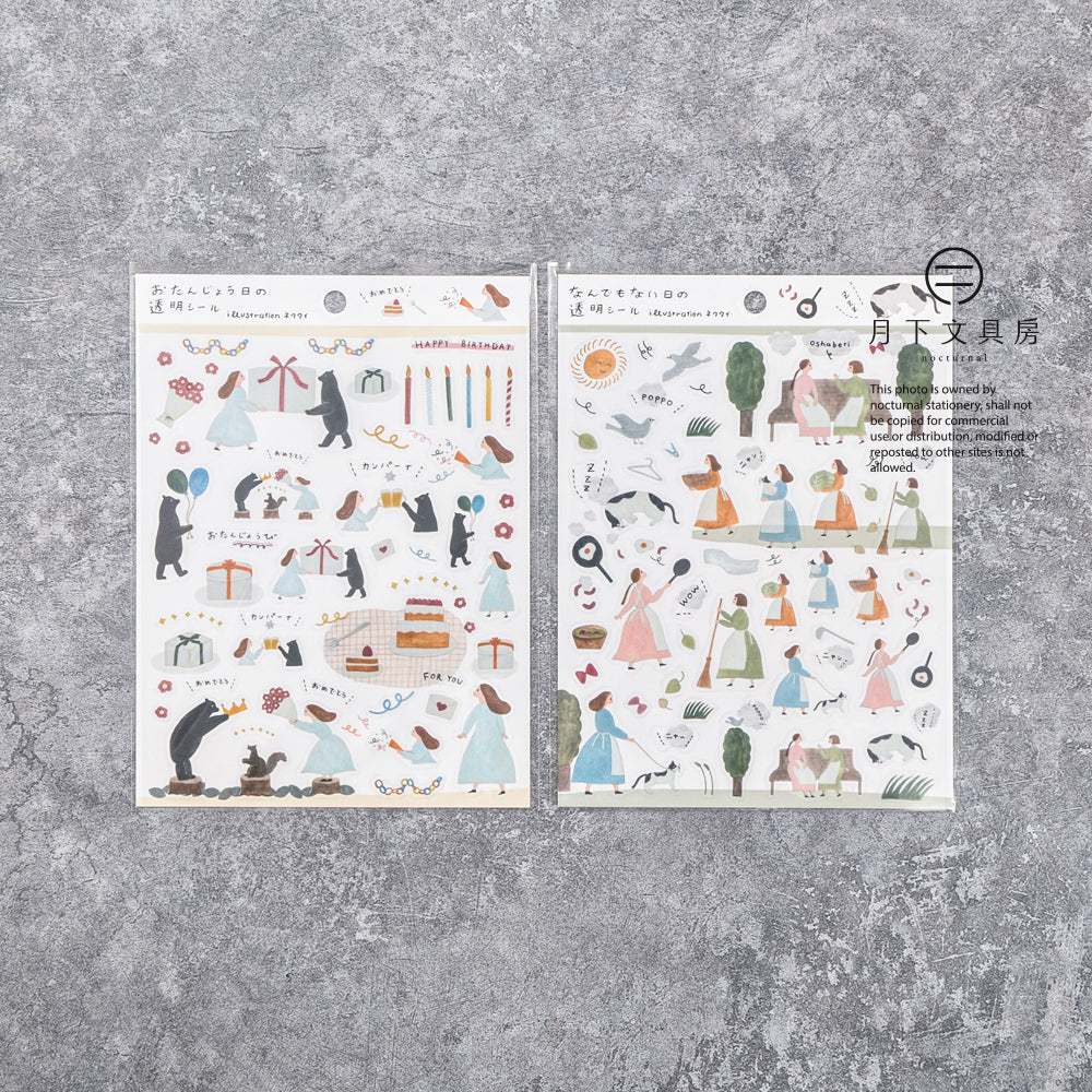 來自北海道的插畫團隊Necktie,主要提供插畫和設計服務,並推出屬於自己的紙製品和網上商店,他們活躍於多個領域,繪本、各式各樣的周邊產品和藝術展覽都是他們的工作範圍,而這次為表現社推出的主題貼紙,將會以生日派對和生活日常作為主題,生日派對將會描繪小熊和女孩子正在慶祝某人生日,而生活日常則描繪了女孩子做家務和與朋友間互動的場景。整張貼紙尺寸約A5,可夾於大部份的手帳之中,方便攜帶。