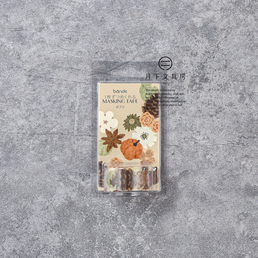 日本文具品牌BANDE向來都以推出手作素材為主,當中的片狀紙膠帶貼紙最為人熟悉,而這次貼紙將會以乾花作為主題,讓你輕易塑造田園風和秋季的感覺,在特別的節日上使用,更能大大提升節日氣氛!一卷共12款不同貼紙,適用於手帳、心意卡和禮物包裝上。