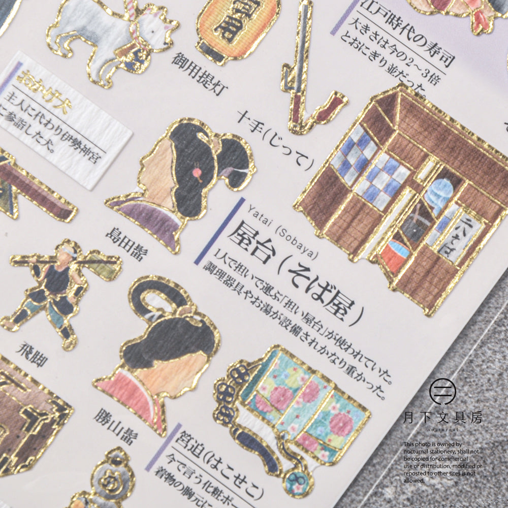 大人向的質感貼紙,全都圍繞著大人感興趣的題材,每張貼紙都燙上了金邊和擁有獨特的紙材紋理,貼紙旁邊附有文字作輕量講解,每一份貼紙猶如一本小型圖鑑,這款以江戶時代作為主題的貼紙,收錄了江戶時代不能認識的名字、物件和文化現象,對日本歷史有興趣的朋友絕對不能錯過~