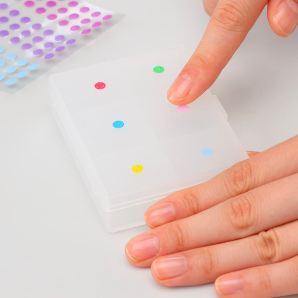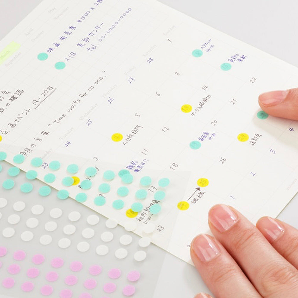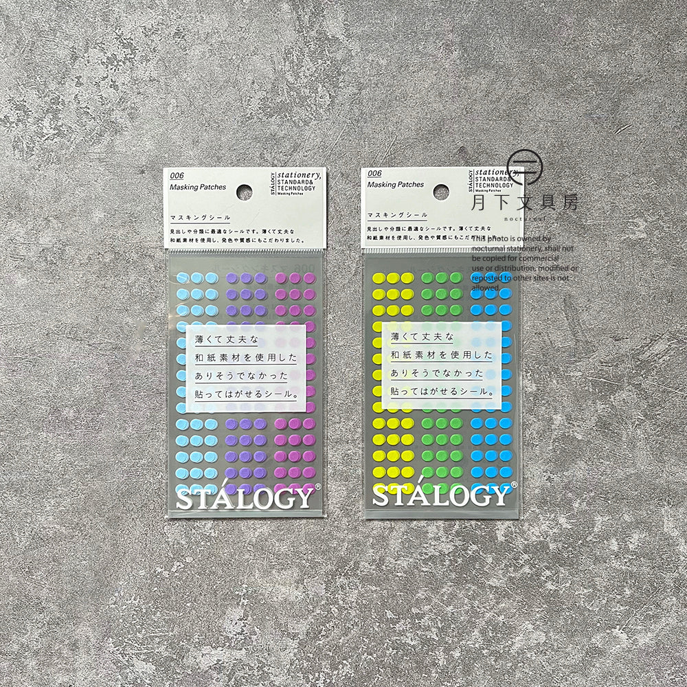日本筆記本品牌STALOGY,由熊本熊之父水野學與具有高水準黏合技術的日東公司所合作創立。在擁有日東的黏合技術支持下,STALOGY推出了一系列黏貼功能的文具,而工作或手帳用家經常會用到的波點貼亦被列入當中,其波點貼採用了和紙材質製造,撕貼方便不留痕﹐貼在文字上不會完全遮蓋資訊,可用作hightlight及標記之用,亦可用以製作圖表或手工波點畫等,波點貼直徑為5mm。現有兩種顏色配搭可供選擇。