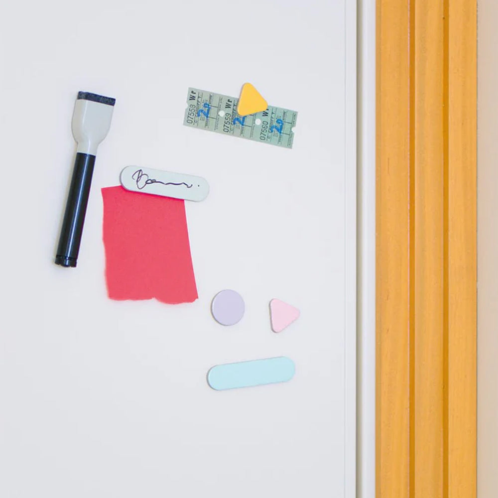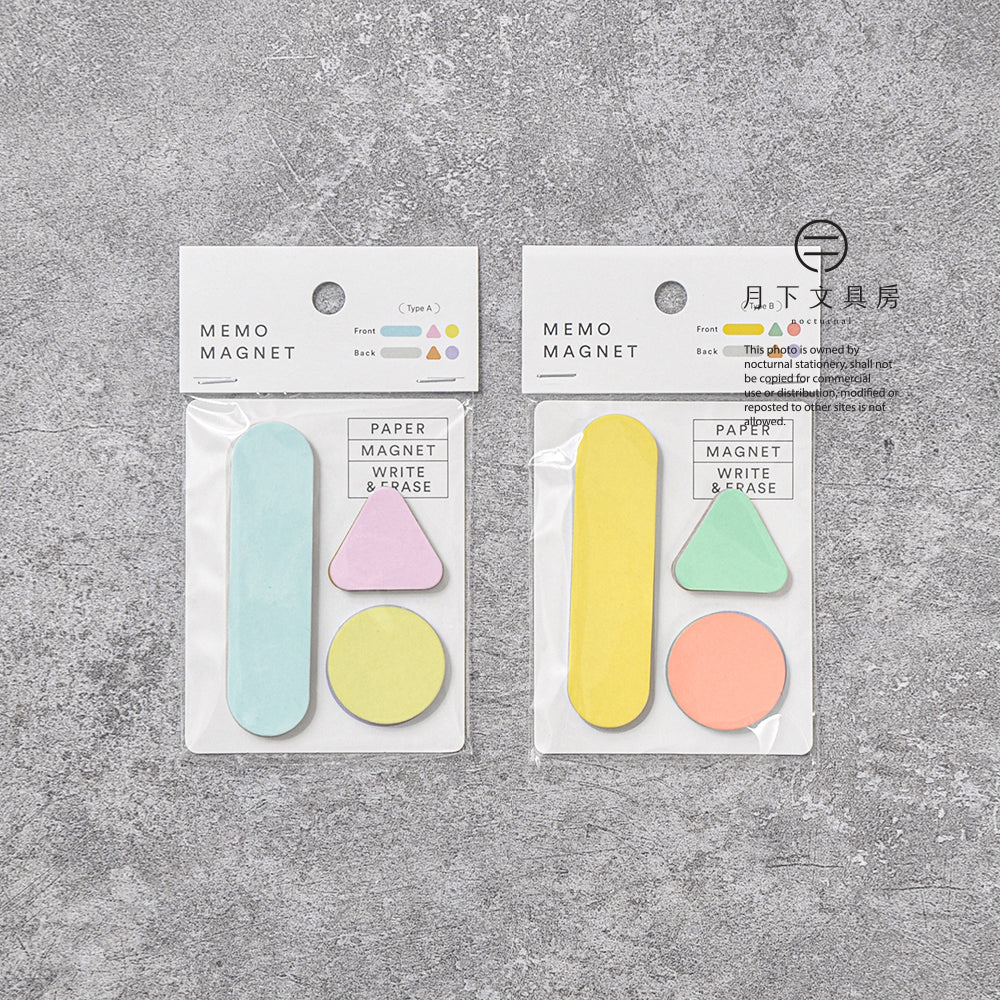 MEMO MAGNET是一款由紙張製成的磁石,一包三款不同形狀,其白板般的表面讓你可使用白板筆書寫,同時亦能使用相應的白板擦擦除,磁石前後各有不同顏色,兩面皆能使用,用家可跟據自己的需要及喜好﹐選用所需的形狀以配搭字條、名信片及各種形式的通告,是一款家中和辦公室都能用得上的實用工具。