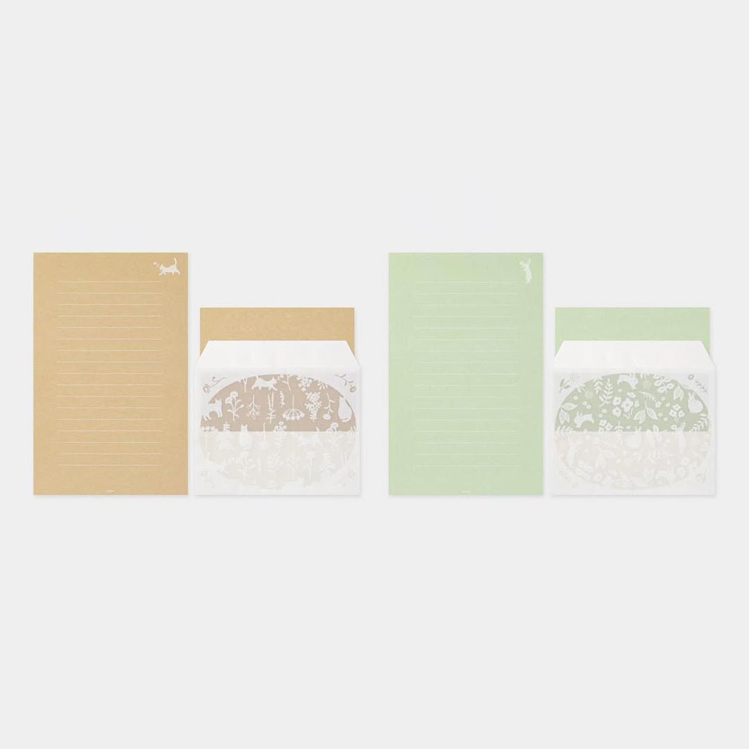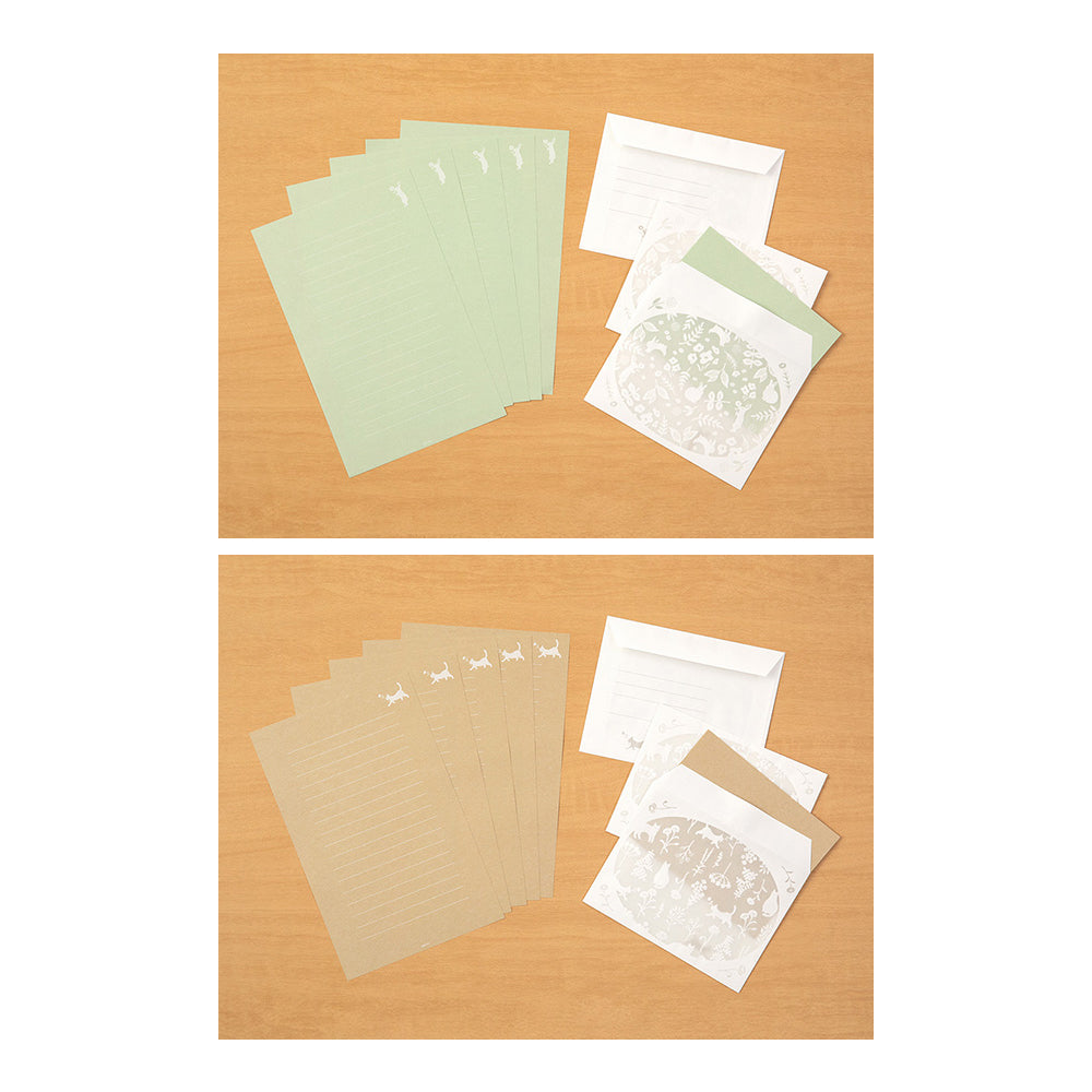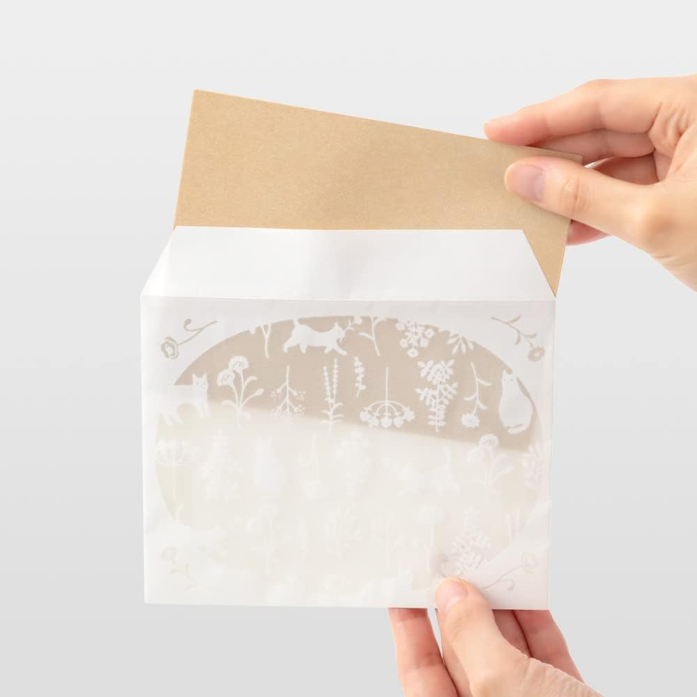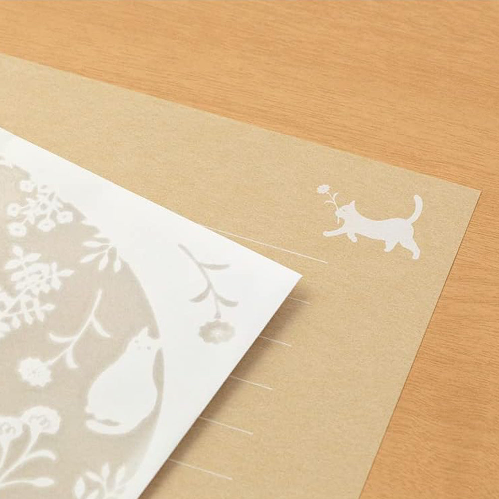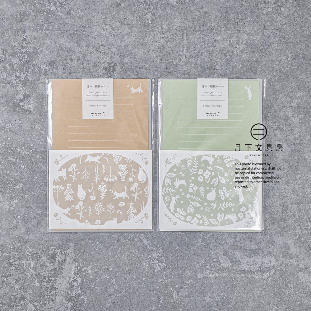 以水印圖案作為賣點的信紙套裝,其信封上圖案以外被鏤空的地方呈半透明,像牛油紙般通透,當附帶的淺色信紙放進信封時,信封上的水印圖案就會顯示出來,極為精緻﹐其柔和和優雅的氛圍治癒寄件及收件人的心靈,套裝包含3個信封及6張信紙,由於其半透設計的關係﹐如需張貼郵票請將之貼在信封的另一邊。