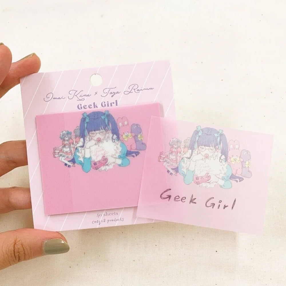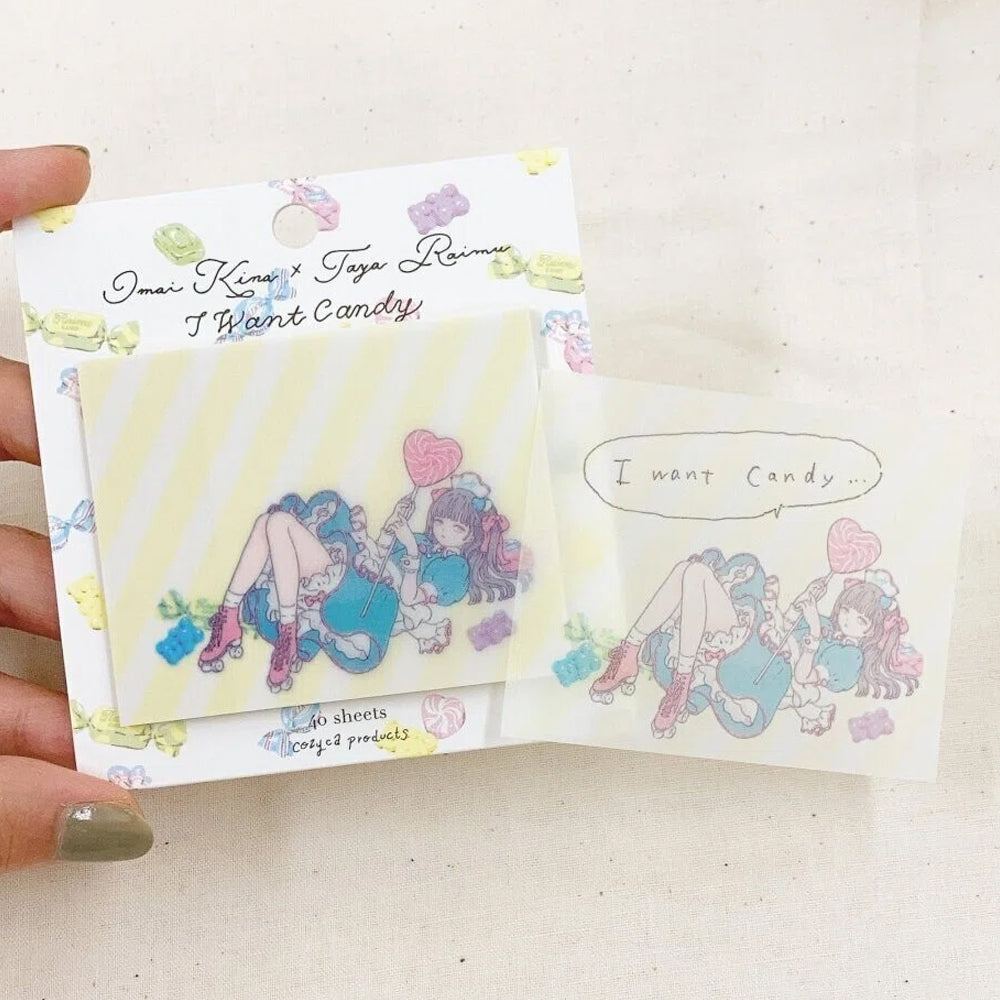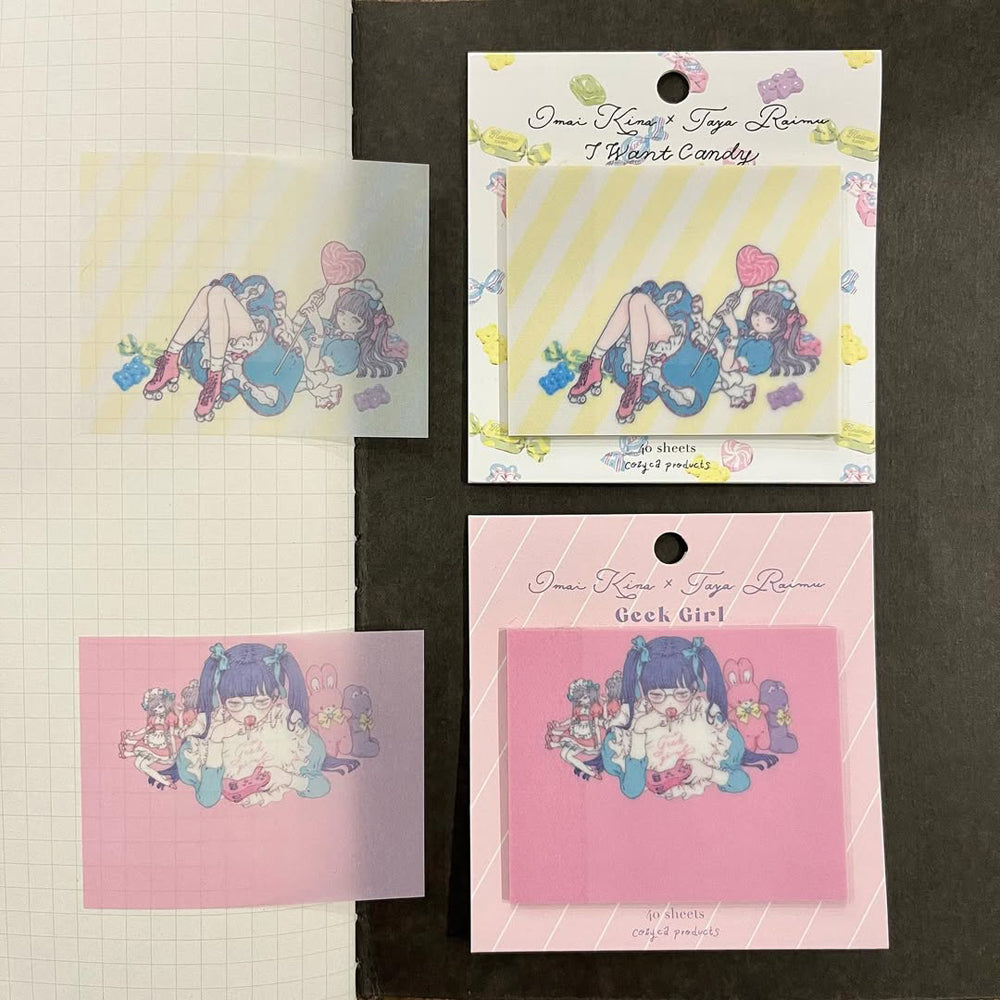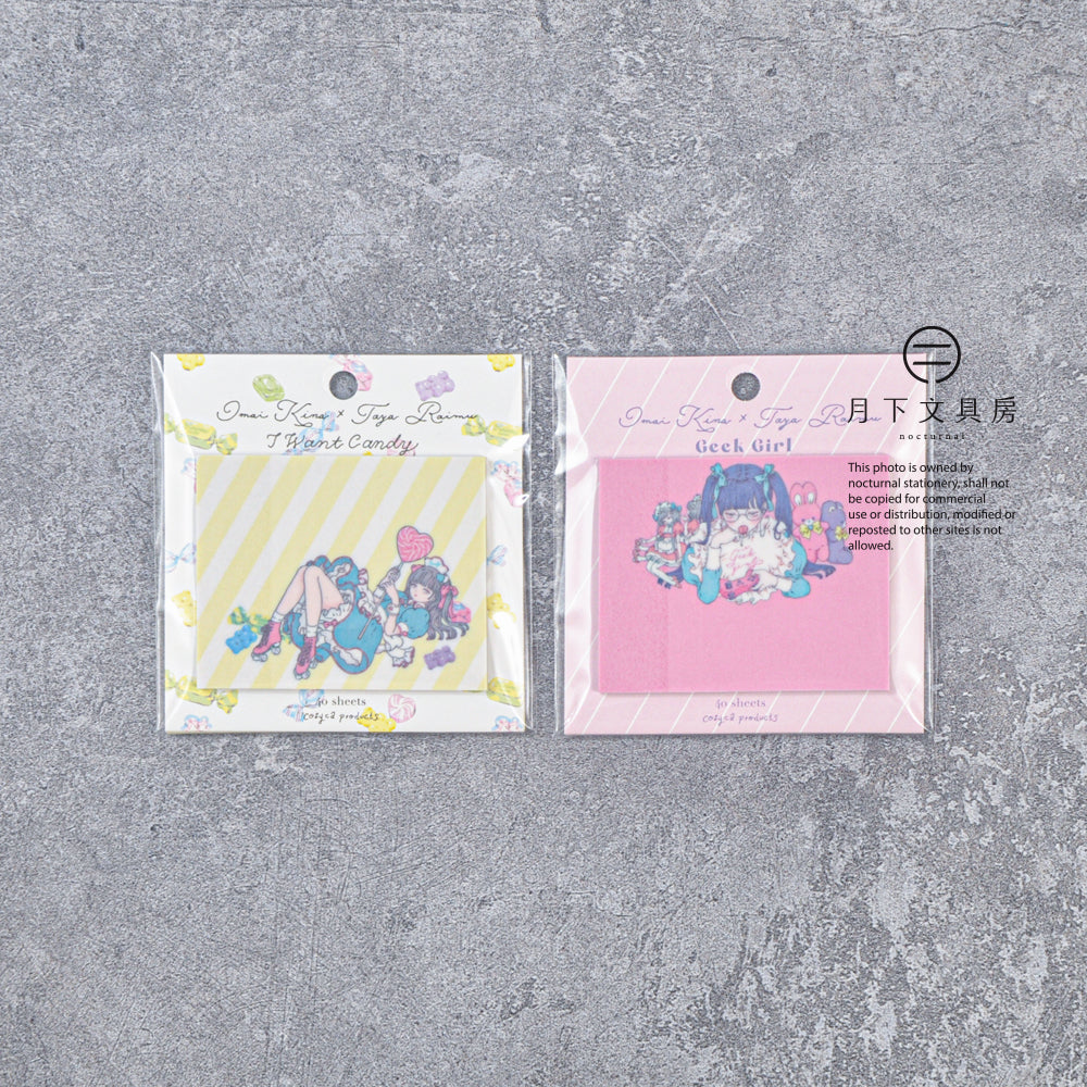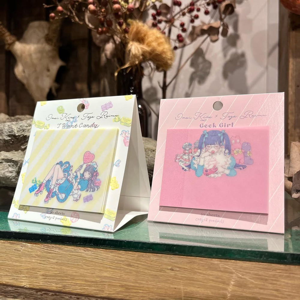 來自日本的插畫家及紡織藝術家今井KIRA,其設計融合了可愛與浪漫的主題,擅於運用柔和的粉系色調的她,是當今蘿莉時圈中最知名的插畫家之一。而多屋來夢,則是活躍於演藝界的人氣模特兒,同時也是蘿莉風格的愛好者,這次的三方合作,今井將會創作兩款以蘿莉風格作為主題的便利貼,並以多屋來夢作為主角,分別是被糖果包圍的< I want Candy>及描繪了宅女打電玩場景的<Geek Girl>,兩款在充滿少女感與可愛氛圍的同時,也巧妙地融合了一點點黑暗的元素,是我們文具房中非常少見的風格。便利貼本身呈半透明,能適用於多個不同場合如筆記、手帳、一般留言信息和禮物包裝等,包裝底卡能摺成三角形的企立狀態,在不使用時能像立牌一般放在你的書桌上。