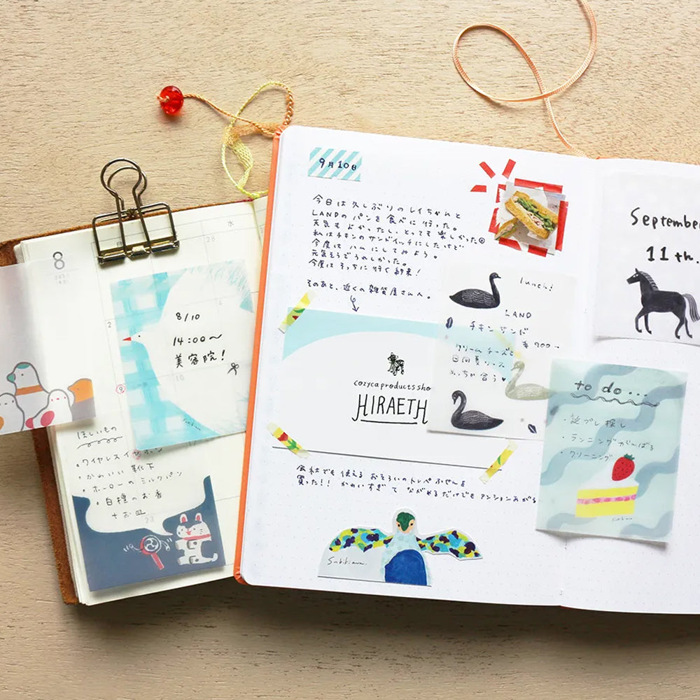 藝術家Subikiawa的<Subikiawa食器店>於2010成立,主力推出紙品、玻璃製品、布製品和木製品,深受雜貨愛好者的喜愛,而這次為表現社設計的一款便利貼,將會以白色小鳥作為題材,配上淺藍色的方格作為背景,有種寫意和自由的感覺,便利貼呈半透明,能適用於多個不同場合如筆記、手帳、一般留言信息和禮物包裝等,包裝底卡能摺成三角形的企立狀態,在不使用時能像立牌一般放在你的書桌上。