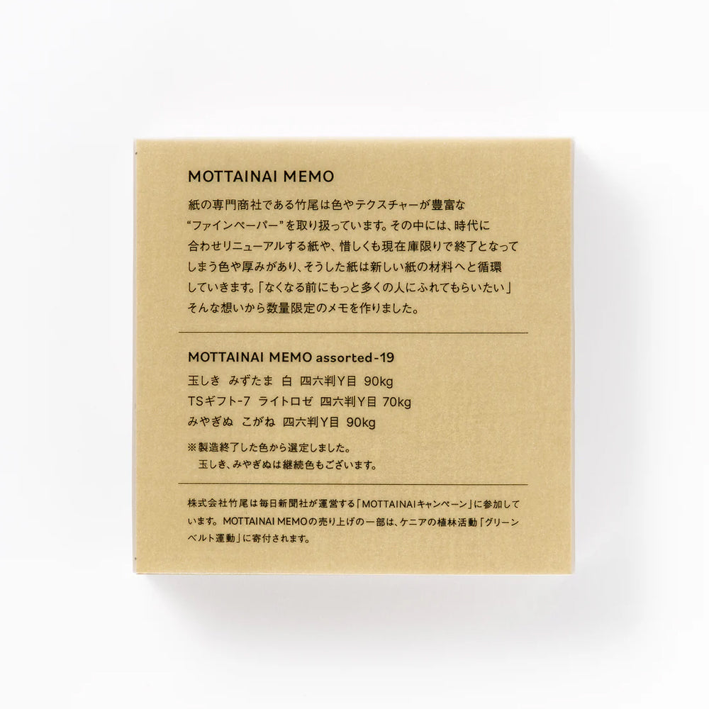 TAKEO竹尾創業於1899年,通過開發和供應具有豐富色彩和質感的高級特殊印刷用紙而聞名,為紙張的發展作出了不少貢獻。而隨著年代的轉變和紙張的革新,竹尾部份的花紋紙將不會再生產,而為了讓這些紙張在消失前讓更多人認識,竹尾就決定將這些紙張裁剪成便條紙的尺寸,以限量的形式推出名為MOTTAINAI MEMO的花紋便條紙,每份便條紙將包含三款不同的花紋紙,每款都擁有不同的觸感和顏色,對於喜歡紙品的朋友來說,絕對不能錯過。