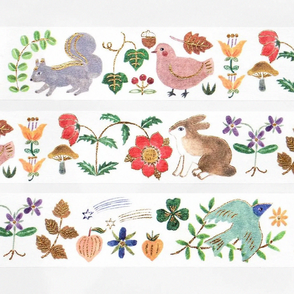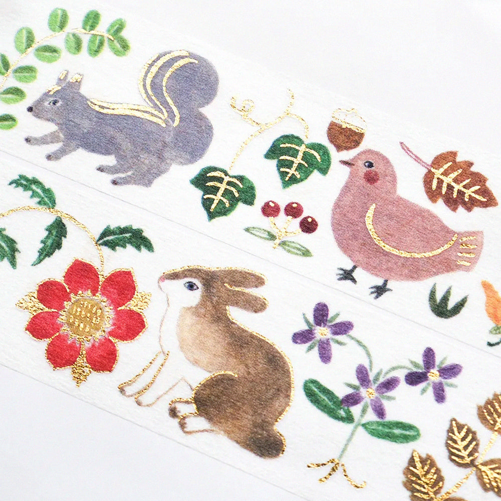 每段都帶有華麗閃爍的金箔!由表現社打造的金箔紙膠帶,擁有和紙膠帶的豐厚觸感,同時因應不同畫師的插畫而配上不同的燙金效果,比一般紙膠帶更具層次感,適合用於手帳裝飾、書信和禮物包裝上。這款由布川愛子繪製的紙膠帶,將以時尚可愛的植物圖案點綴著花朵和各種動物,配上閃亮的金箔,更添亮點。