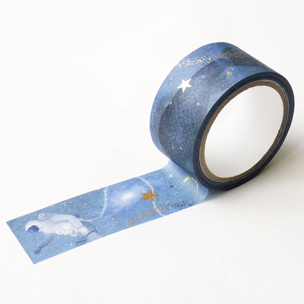 每段都帶有華麗閃爍的金箔!由表現社打造的金箔紙膠帶,擁有和紙膠帶的豐厚觸感,同時因應不同畫師的插畫而配上不同的燙金效果,比一般紙膠帶更具層次感,適合用於手帳裝飾、書信和禮物包裝上。這款由日下明繪製的紙膠帶,將描繪了宇宙與深海相連,漂浮在深藍色中的宇航員和在深海魚,仿佛存在著某種連結,會讓人不自覺去想像其插畫背後的故事和意義。