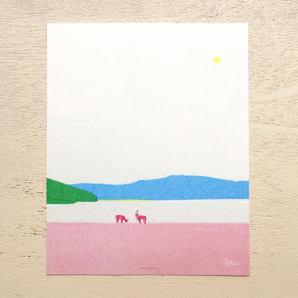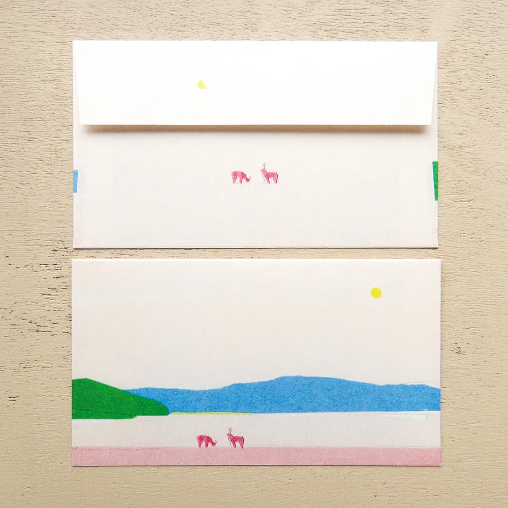 插畫家坂内拓來自東京都,其作品多以拼貼作品為主,曾參與廣告、書籍、雜誌和專輯封面等不同媒體的藝術創作,擅於以抒情的視角捕捉日常風景,留白的極簡主義讓觀者留下想像空間,編織出各種故事。而這款信紙套裝繼續以坂内拓的拼貼作品為主,簡約的用色、形狀和一大片留白所構成的插畫,讓人感受到遼闊的空間延伸和寧靜,信封及信紙採用了帶有粗糙觸感的美濃和紙,讓距離再遠的親友,都能感受到你字裡行間和紙張所帶來的溫度。