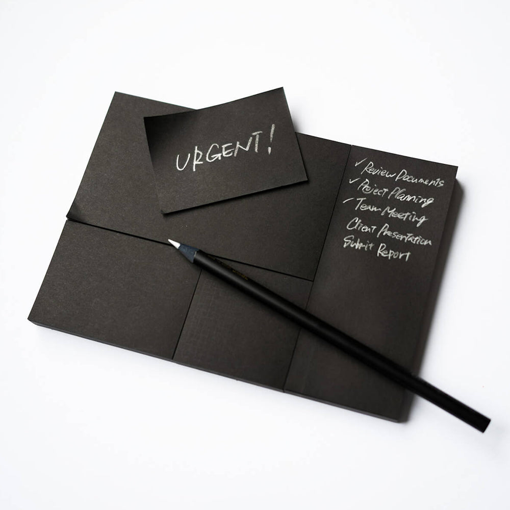 由CDT以全新角度詮釋的便利貼﹐透過全黑紙材,帶來截然不同的書寫體驗,用家可透過白色墨水、粉彩、木顏色和金屬色筆畫出強烈對比的文字和圖像,令內容更沉穩有力,印象更深刻。便利貼組分B6及B7兩款,每款均包括了不同尺寸的便利貼組合、當中3mm方眼的便利貼,格線採用了黑綠色印製,細微點綴卻不干擾視線。