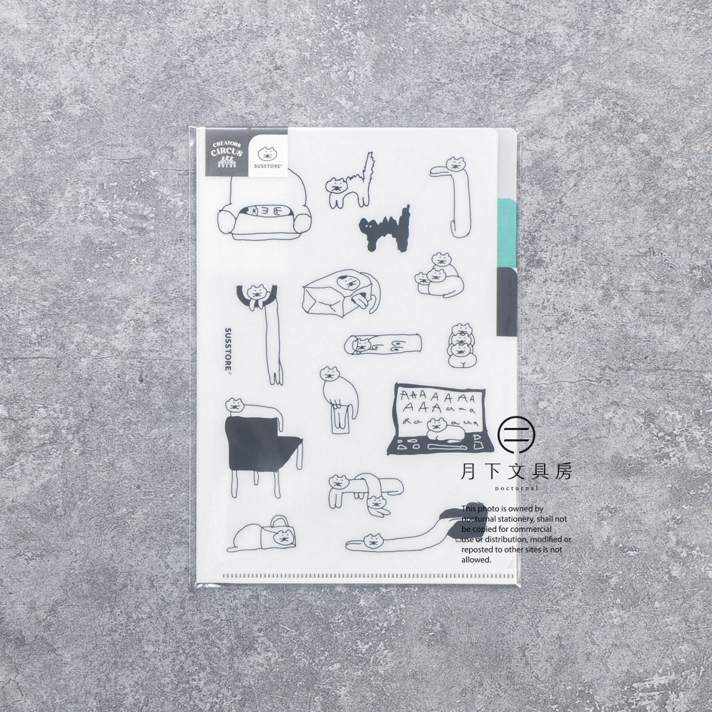 日本文具品牌FRONTIER所展開的CREATORS CIRCUS計劃,是一個為不同插畫師所建立的全新舞台,透過將不同的插畫融入各種文具、貼紙和明信片產品,令這些充滿個性的插畫變得能觸手可及,藉此提升每位插畫師的曝光度和更多的作品被看見。這款文件夾由來自韓國的SUSSTORE負責繪畫,其作品專注呈現貓咪俏皮、可愛的一瞬間,深受貓奴和文具控喜愛。文件夾設有三層分隔,方便整理不同種類的文件或紙品。