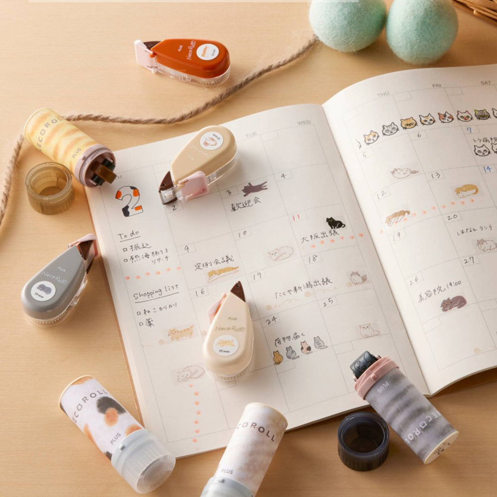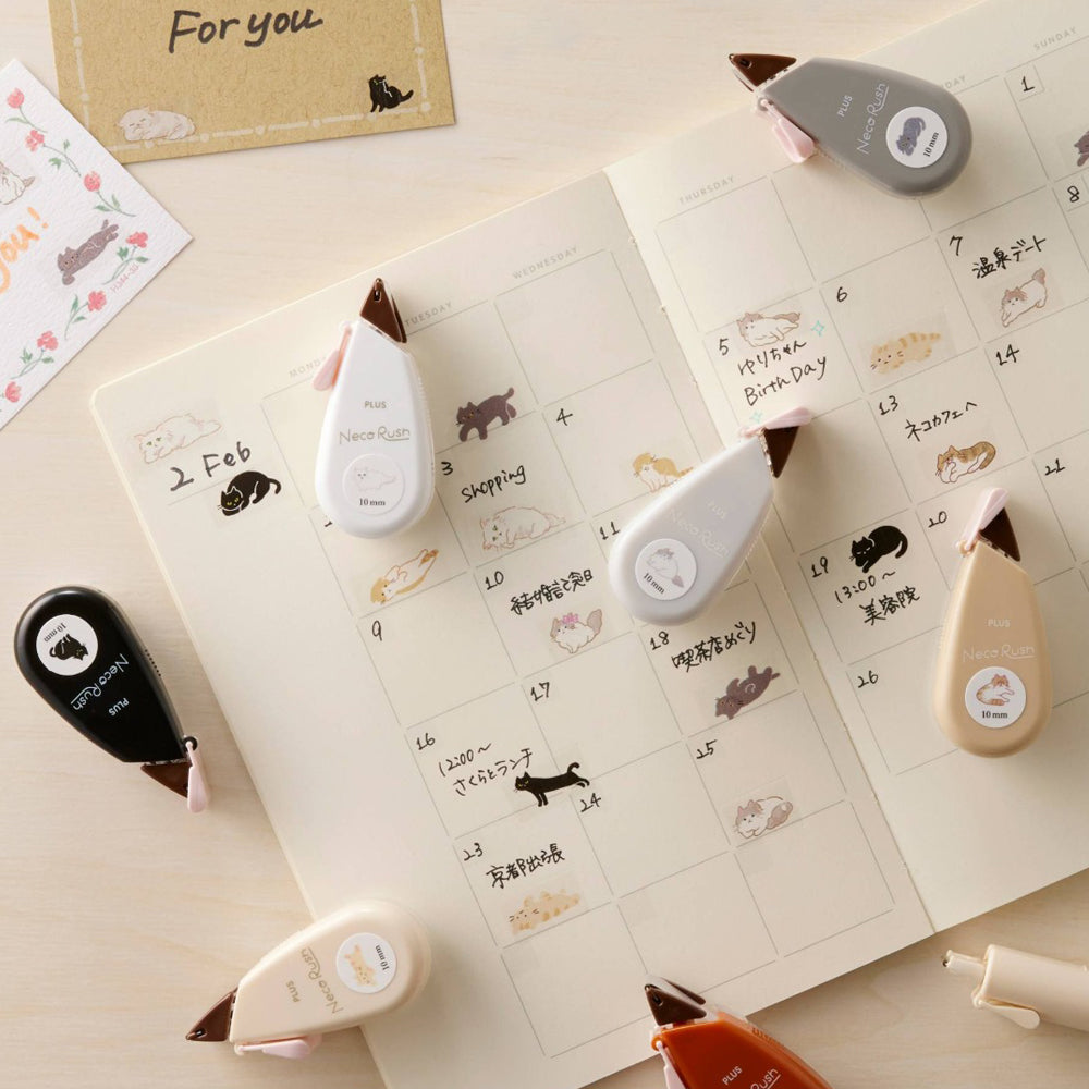 Neco Rush花邊膠帶的全新限定產品,而主題更加是深受大眾歡迎的貓咪系列!Neco Rush的使用方法跟一般改錯帶差不多,只要貼著物件表面輕輕拉出,就會出現不同的貓咪表情和姿勢,讓貓奴的心一秒融化,由於使用方法簡單,不論手帳、筆記本、便條甚至心意卡都適用,而且機身小巧可愛,方便攜帶,前端更附有保護蓋,讓用家收納和攜帶時更放心。